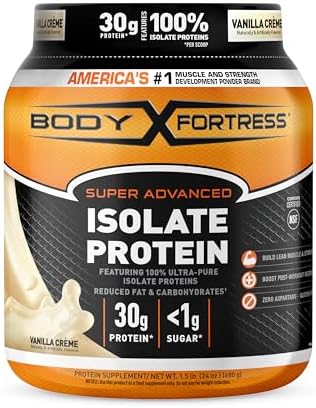 Body Fortress Super Advanced Vanilla Creme Flavored Isolate Protein Powder contains a proprietary blend of fast, medium, and slow acting proteins that work together to deliver a sustained-release of amino acids, plus a full dose of Betaine to support lean mass.(1) This scientifically advanced whey protein isolate powder contains 30 grams of protein delivering 6 grams of BCAAs per scoop to boost post workout recovery and build lean muscle and strength.(1) State-of-the-art purification in this whey protein powder blend creates a highly concentrated protein isolate with reduced amounts of unwanted fat, carbohydrates, and cholesterol compared to protein concentrates. This Body Fortress protein powder is the ideal multi-functional formula for a pre and post workout recovery drink, a protein shake between meals, or a muscle recovery protein supplement before bed.(1)