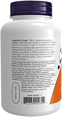 Now L-Arginine comes in extra strength 1,000 mg tablets and is non-GMO. Arginine is a conditionally essential basic amino acid involved primarily in urea metabolism and excretion, as well as in DNA synthesis and protein production. It is an important precursor of nitric oxide (NO) and thus plays a role in the dilation of blood vessels. The L-Arginine used in this product is pharmaceutical grade. Natural color variation may occur in this product.