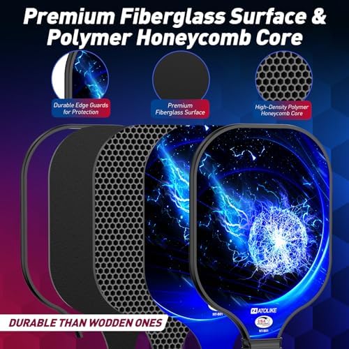 【Premium Paddles】NATOLIKE pickleball rackets are made of premium fiberglass face and high-density polymer honeycomb core, which makes the rackets lightweight and strong. Fiberglass surface provides excellent spin to the ball. Polypropylene honeycomb core absorb vibration from each hit and achieves constant speed. The design of the racket allows you to grasp the rhythm of offense and defense at any time. Edge guards protect the paddle from knocks and scrapes and extend its life.