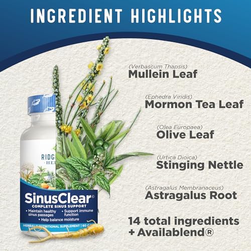 NATURAL INGREDIENTS: The stimulant-free formula of SinusClear includes natural ingredients like Mullein Leaf, Mormon Tea Leaf, Astragalus Root, Olive Leaf Extract, Stinging Nettle Leaf, Bromelain, Rosemary Leaf, Yerba Santa Leaf, Rooibos Leaf, Eucalyptus Leaf, Angelica Root, Burdock Root, and Availablend Bioavailability Complex for a natural approach for sinus health.